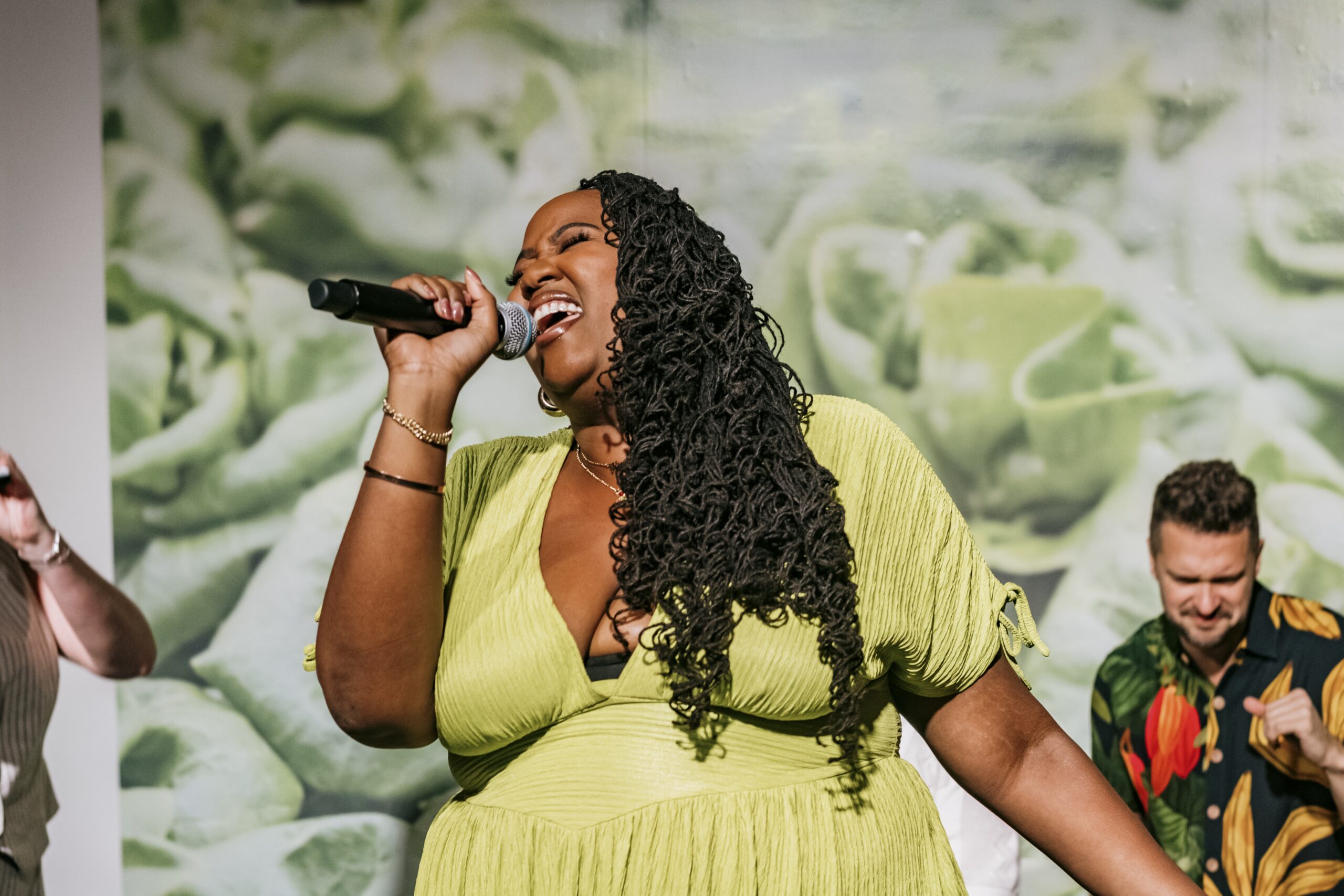 TFFJ Students, Najae S., and Kaity T. with TFFJ Alum Miguel G.