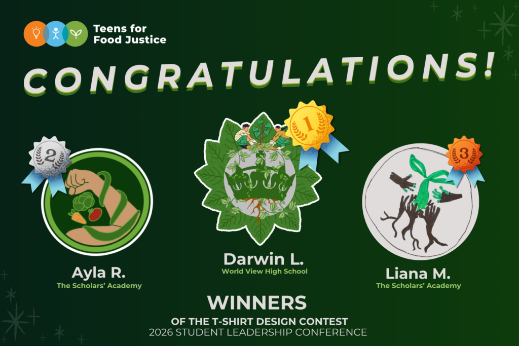 For the second year in a row, Teens for Food Justice invited students across its network to shape the visual identity of the Student Leadership Conference through a T-shirt design contest. This year, the winners were chosen by the people who know the conference best: TFFJ alumni.
