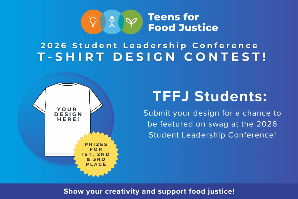 Teens for Food Justice (TFFJ) invites all students from campuses with TFFJ farms to create a design for the official T-shirt for this year’s Student Leadership Conference (SLC). Your design could appear on the official T-shirt, event signage, and other conference swag at one of TFFJ’s biggest events of the year.